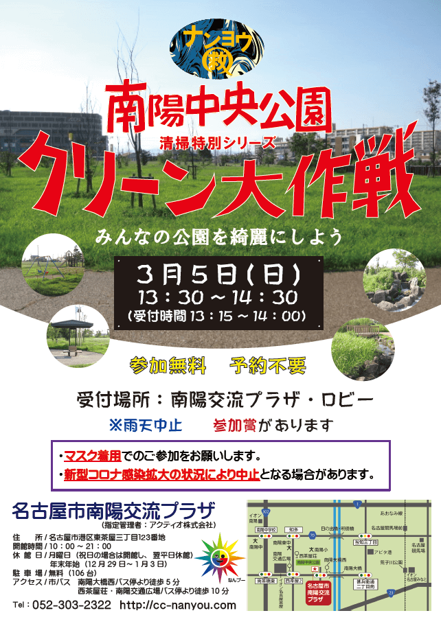 3月5日(日)は『南陽中央公園クリーン大作戦』を開催します!! 時間は13:30~14:30 参加無料です!