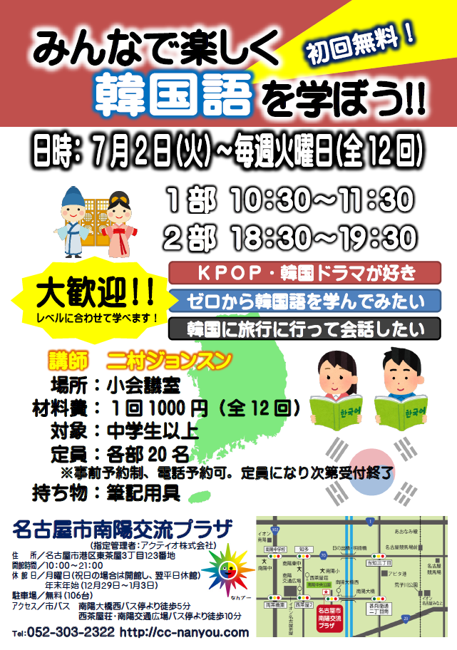 2部 18:30~19:30 韓国語講座の無料体験会を開催します❕