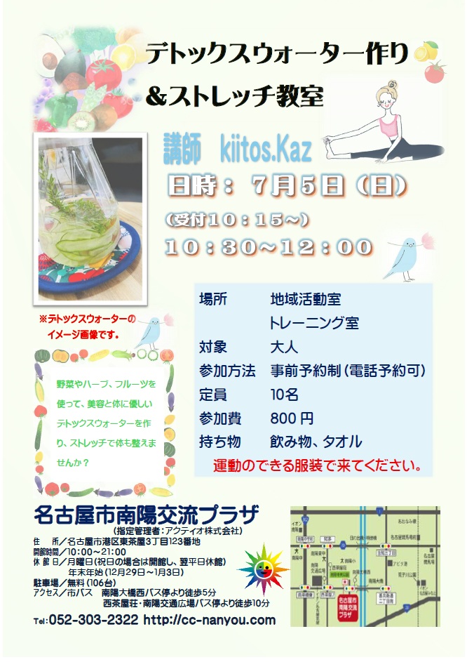 | 講座名 | デトックスウォーター作り&ストレッチ教室 |